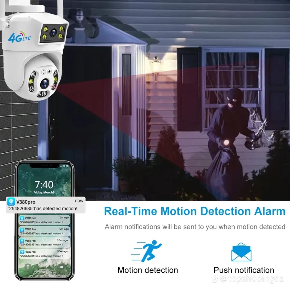 و اذا شافت انسان او حركة مشبوهة مباشرة تبعثلك رسالة تنبهية للهاتف تاعك اينما كنت فالعالم